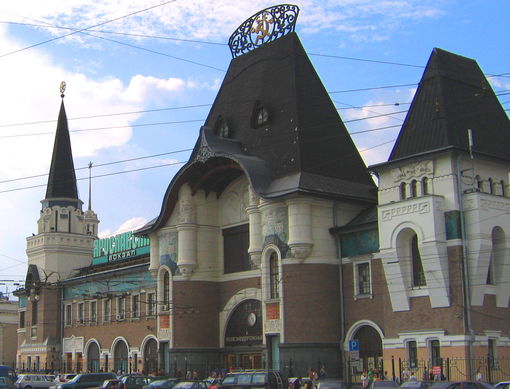 Ярославский вокзал, расположенный в Москве на Комсомольской площади, является одним из символов Москвы. Современный вид он приобрел благодаря архитектору Фёдору Шехтелю, которому было поручено реконструировать и увеличить вокзал, построенный Романом Кузьминым. Шехтель сумел передать стилистику северных зданий России. Мне особенно нравится фигурная крыша вокзала, похожая на терем, и окна в виде арок.