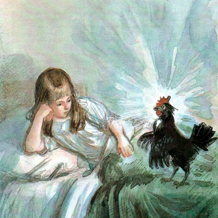 3) Лишь только они подошли к ней, как соскочили со стен два рыцаря, ударили копьями об щиты и бросились на черную курицу. Чернушка подняла хохол, распустила крылья… Вдруг сделалась большая-большая, выше рыцарей, — и начала с ними сражаться!
