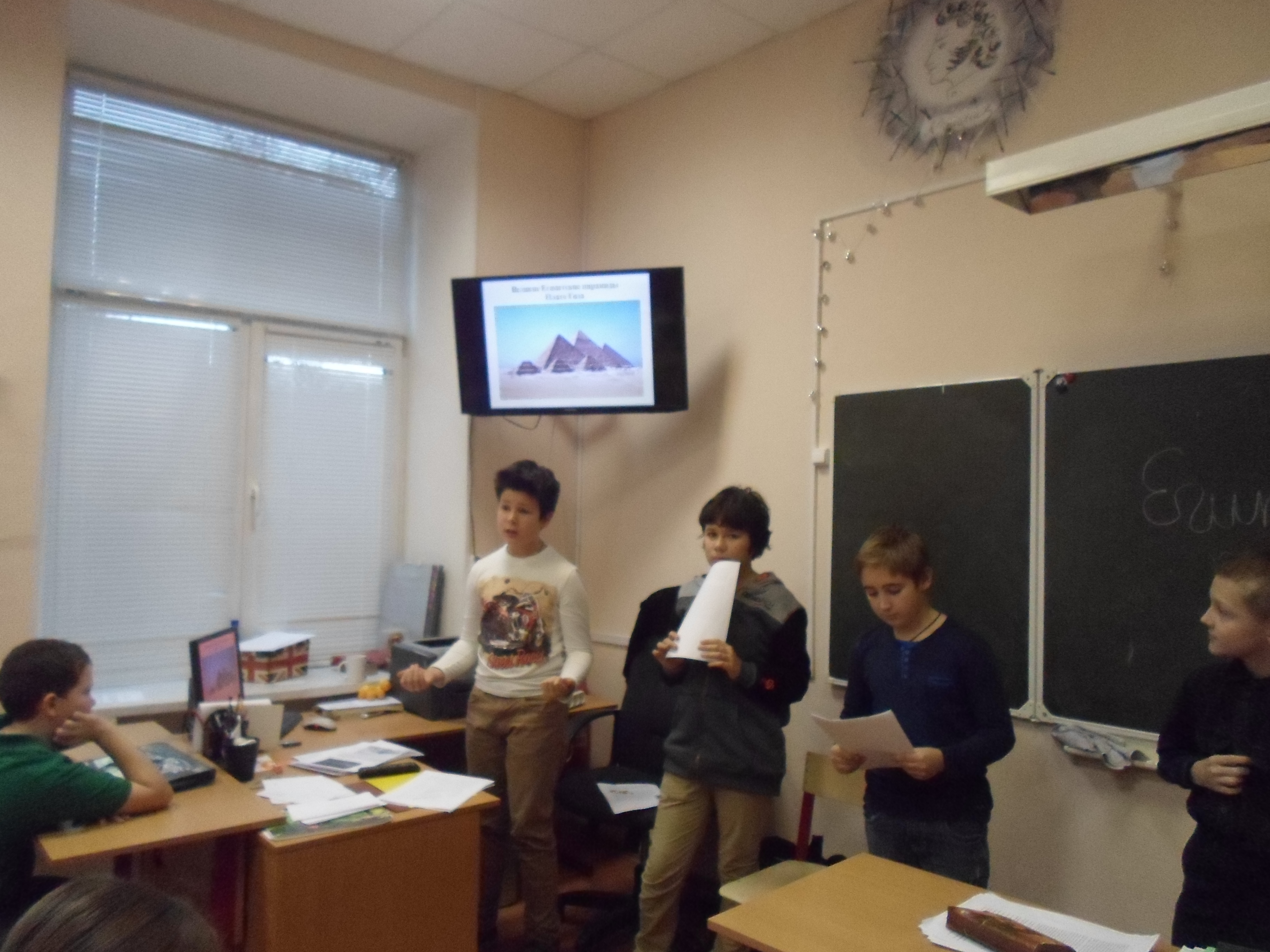 Сегодня группа проектной группы 6 "Б" Александр В., Иван Л., Артемий Г. и Василий Д.провели урок-игру. Тема - "Чудесные пирамиды" на элективных курсах.